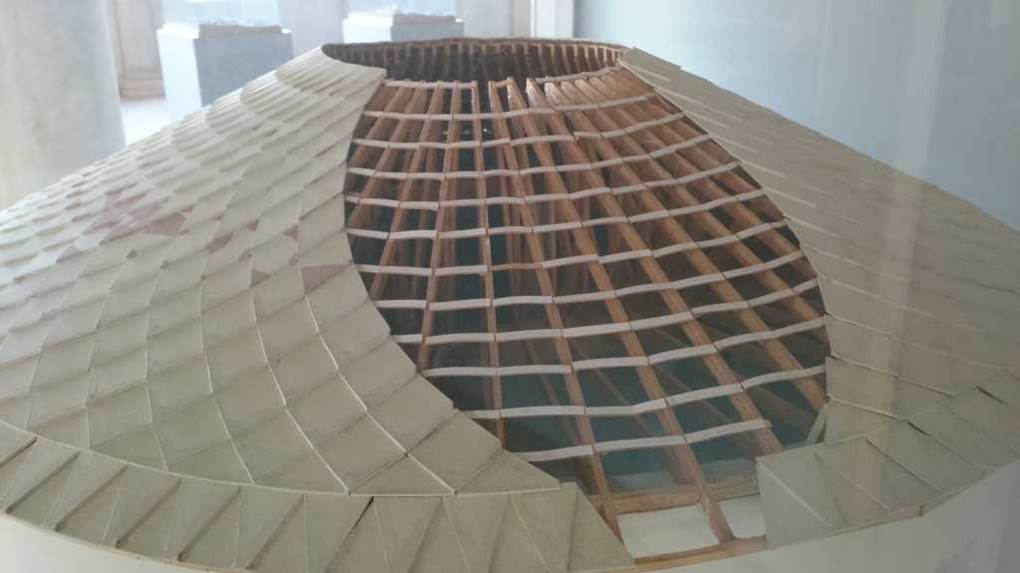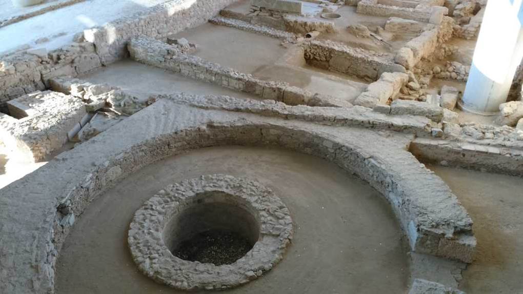 もともとの敷地は、兵舎の大きな区画であった。新築博物館の設計が終わった後になって、地面の発掘を行なうと出てきたのは個人の普通の家と工房の2層の遺構であった。下層は古典期のもの、上層は東ローマ帝国初期のものだった(下) そのため対策がとられ、設置建物を地面から浮かし、床には透明ガラスの厚板を設置し、遺構を上から観察出来るように設計変更を行なった。
