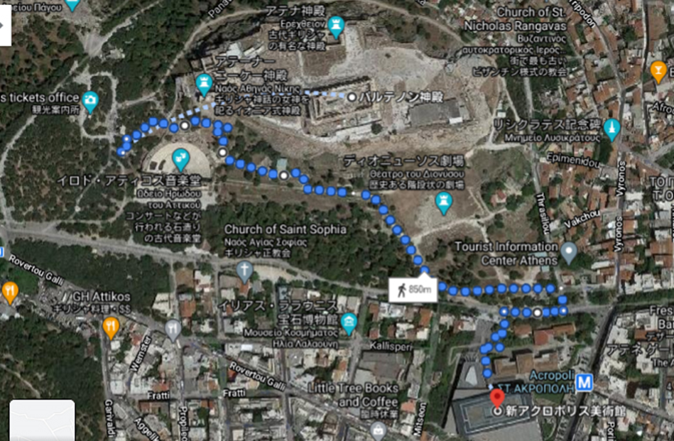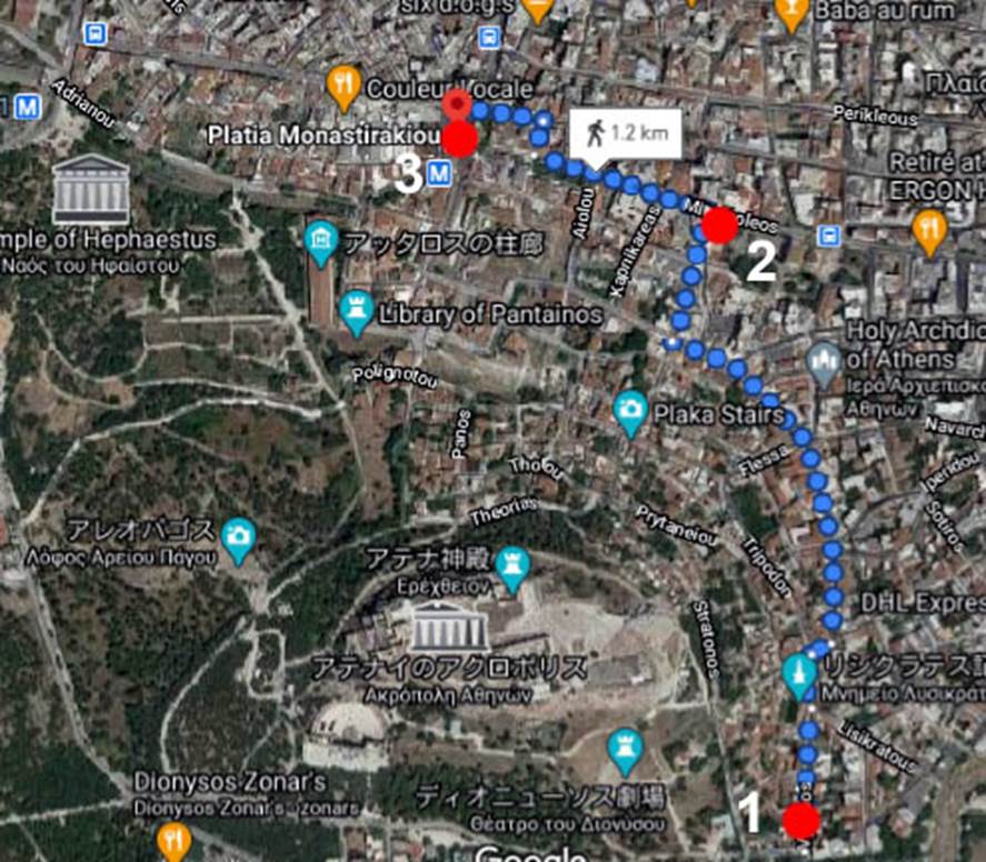 1 新アクロポリス美術館 → 2 プラカホテル → 3 モナスティラキ広場