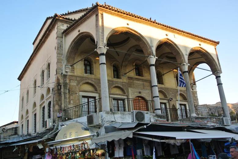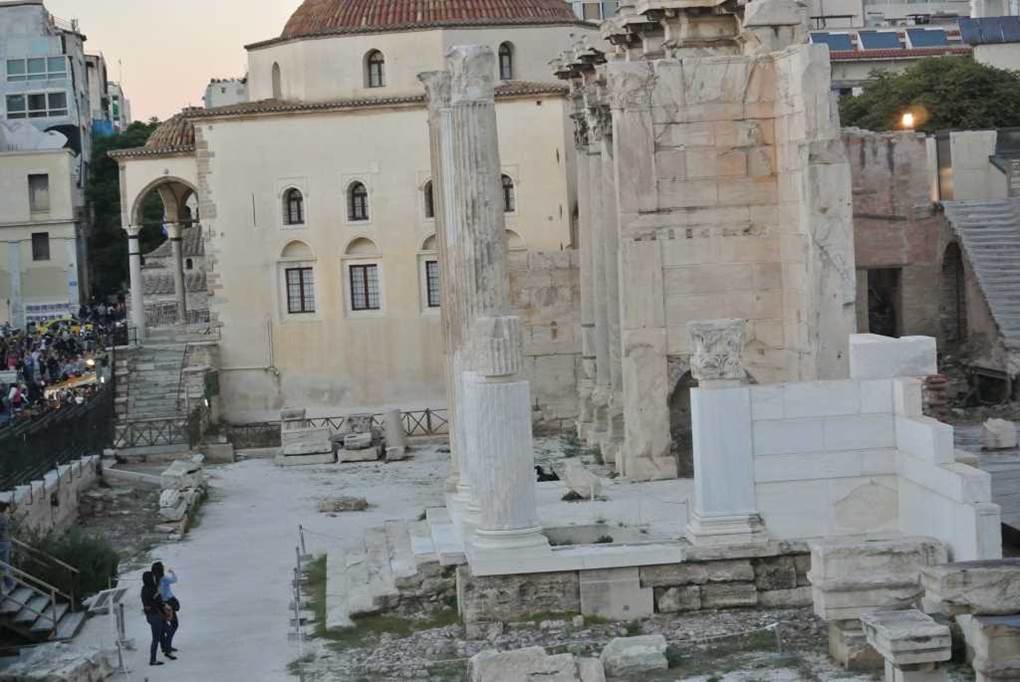 ツィスタラキス・モスクは1759年にオスマン帝国のアテネ知事ツィスタラキスによって建てられた。(下)ツィスタラキスはモスク建設時に後述のハドリアヌスの図書館の大理石の円柱を建築材料として流用したとされる。オスマン帝国の許可なく古代の建造物を破壊した規則違反に対する重い罰金刑を受け、ツィスタラキスは失脚したといわれている。