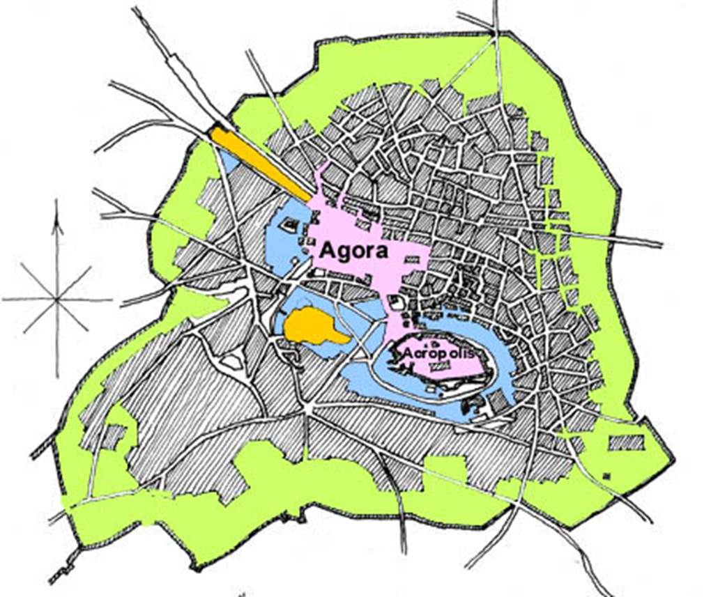 ギリシア都市の主要な構成要素は、敵に包囲されたときに市民が逃げ込む最後の要塞であり、神殿の並んだ宗教的な聖域アクロポリスと、都市の中心広場であり、市場や商業の場でもあり、劇場や闘技場などの文化施設であったアゴラ。