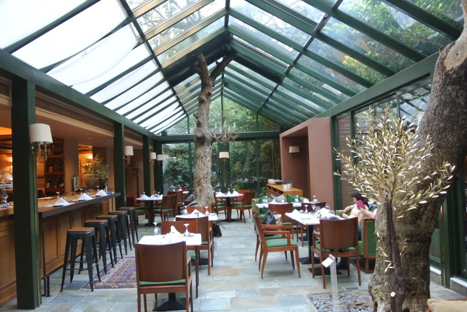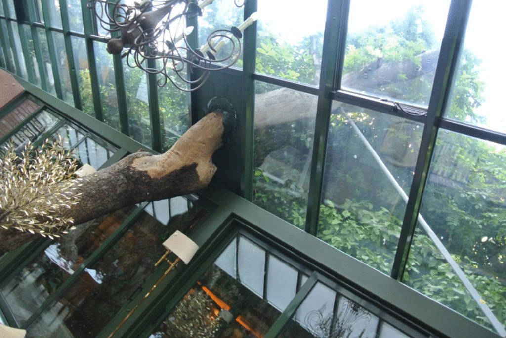 樹木が屋根をつき抜け、ガラス屋根の上は葉が広がり、心地よい遮光になっています。