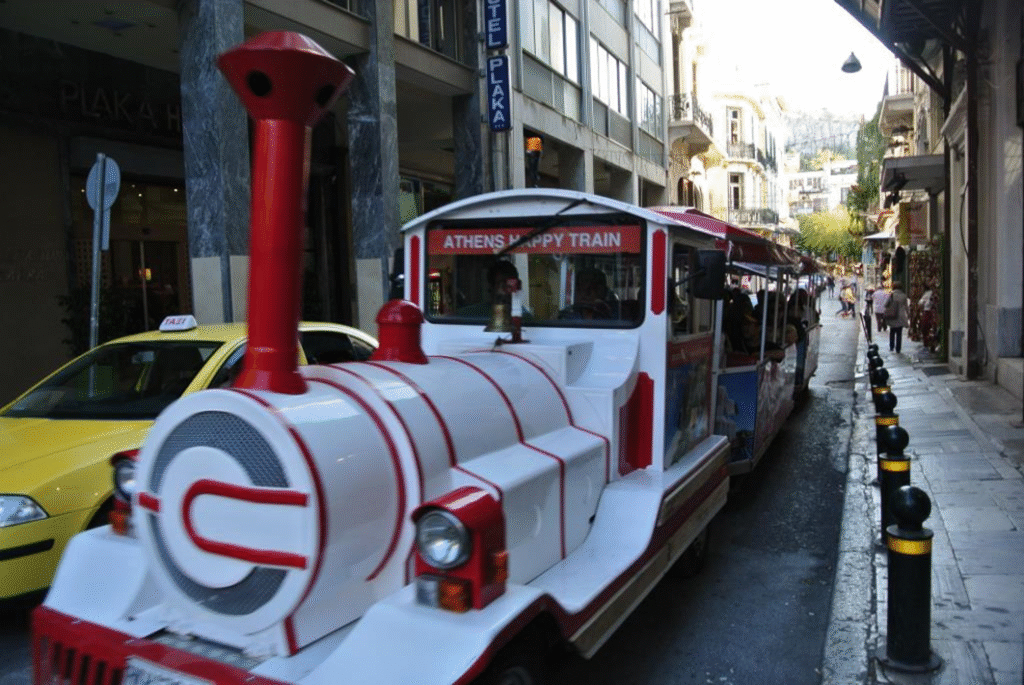 細く入り組んだ路地に ATHENS HAPPY TRAINが3両編成で通り抜けます。