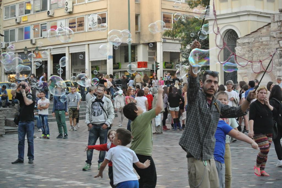 大勢の旅行者や地元の人達の集まる広場に出ました。地下鉄モナスティラキ駅もあり、中央に噴水があり、その周りでシャボン玉遊びで盛り上がっていました。