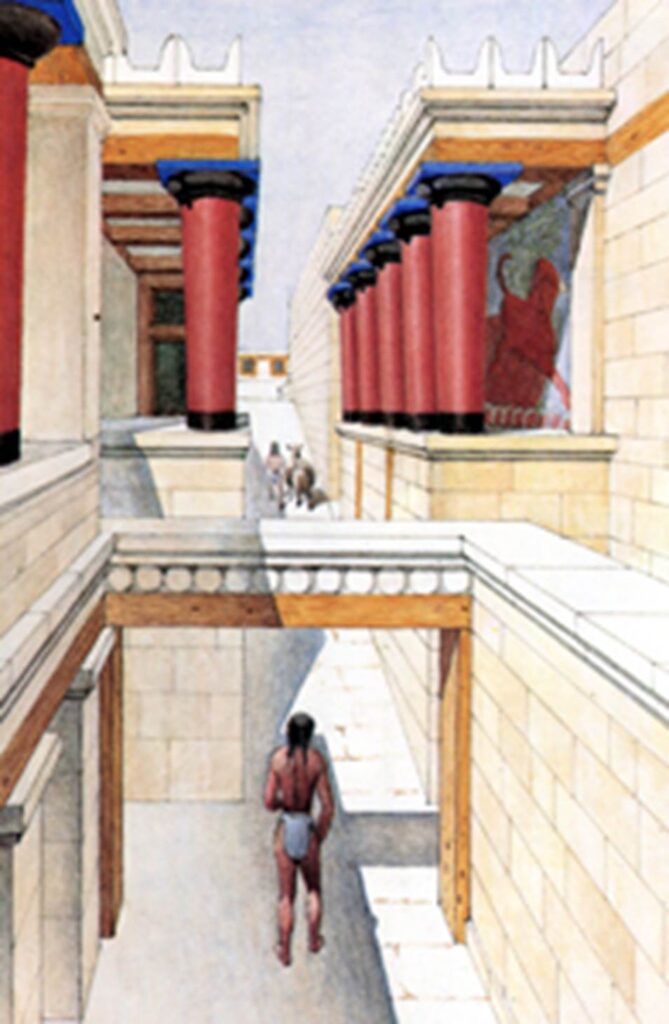 中央広場の南側入り口?の想像復元図。赤い列柱と階段のデザインが特徴です。紀元前2000年ごろ、この様な都会的なデザインが出現したことに驚かざるを得ない。