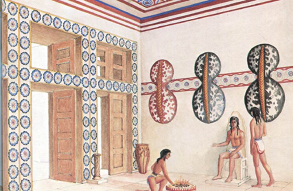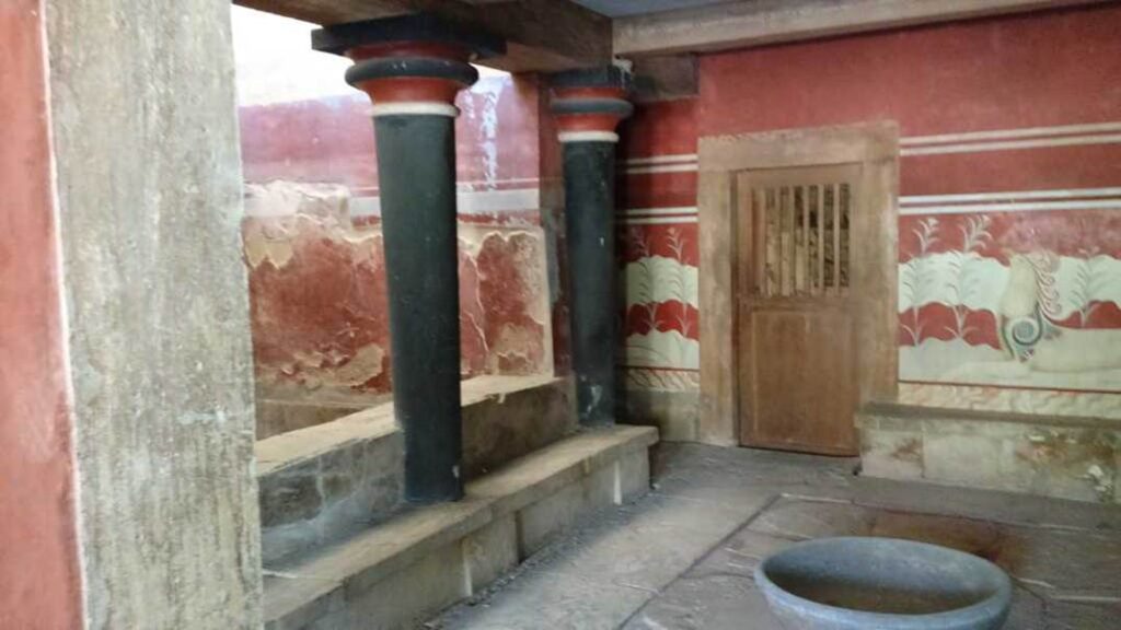 クノッソス宮殿における王座の間。身を清めるための聖水を入れたと考えられる水盤が玉座の前に置かれています。壁には空想上の動物グリフィンが描かれています。