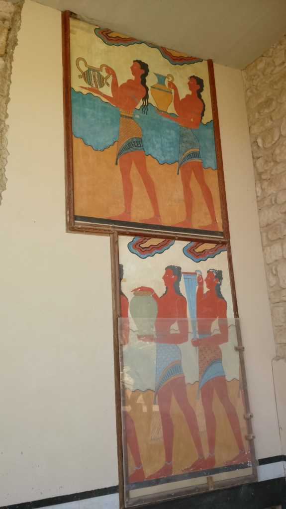 宮殿への南側入り口の近くにある「百合の王子」の壁画です。若者が百合と孔雀の宝石を被っていることから、この名前が付けられています。この壁画はレプリカで、オリジナルはイラクリオン考古学博物館(後述)で保存展示されています。