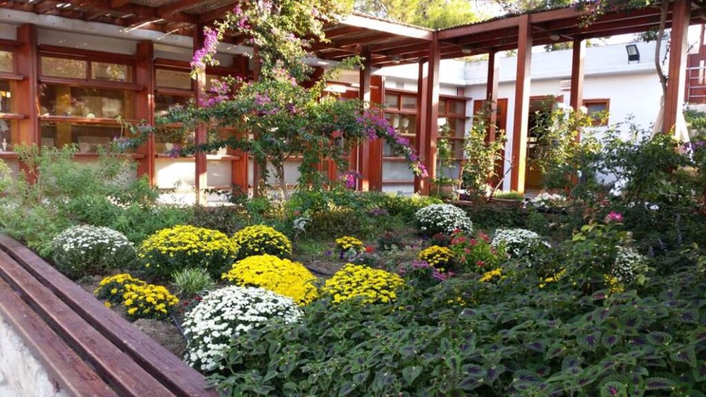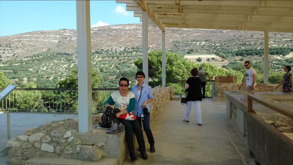 石とレンガだけの遺跡、クノッソス宮殿は、10月でも炎天下であり、見学に数時間を要した。この休憩所の建物は、それとは対照的で、ギリシャとしては珍しい木造建築で、みどりの中庭も備えられていた。この建物を企画した人は、その対称性を売り物とする賢い選択をして、商売を繁盛させている。