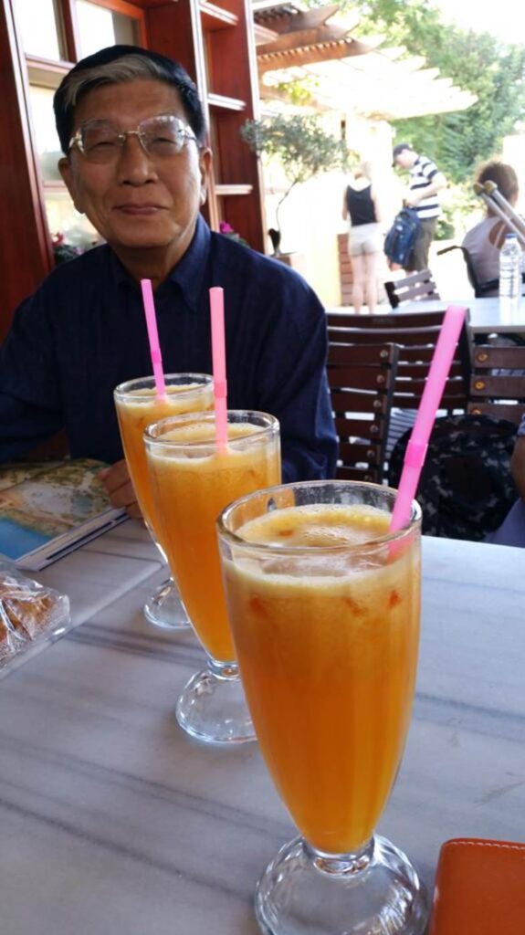 この天然100%の絞りたてのオレンジジュースは、ほぼ全部の旅行客が列をなし注文していました。一時間にわたる日射・炎天のクノッソス宮殿訪問の直後で、まさに絶好の飲み物でした。