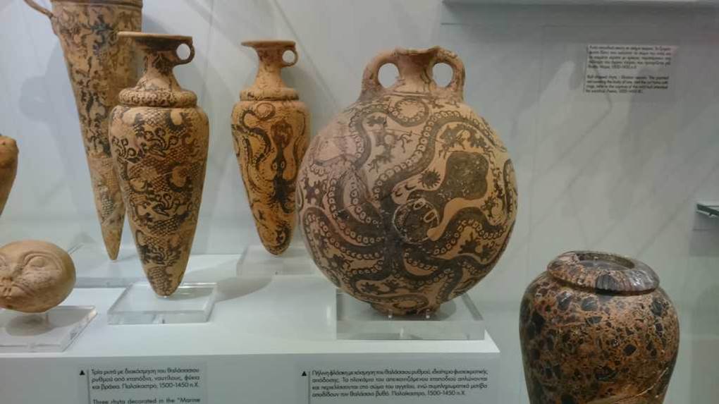 海の生き物を描いた各種の壺が陳列されていた。タコ、イカ、サカナが壷に表現されています。彼らは海洋民族であったことが良く分かります。紀元前15世紀ころのもの。