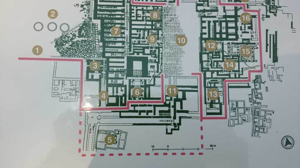 宮殿の一辺は160m以上あり、部屋は1200個以上、部分的には4階建ての建造物すらもあったとされる。この宮殿の最大の特徴は中央広場で、この広場とそれを囲むようにして重要な施設が配置されている。宮殿の建築跡は、強い王権と高度な官僚機構との存在したことを示している。巨大な倉庫も備えていて、ここに支配領域内の物資を集積して再配分を行い、物流を支配していたと考えられる。宮殿には広い中庭を中心に、その周囲に多くの貯蔵庫や作業所、祭祀を行ったと思われる場所、そして居住区が置かれている。