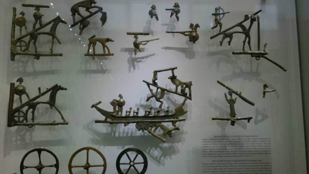 3000-4000年前の人間と動力(馬、牛、車、舟)の関係を表現した金属の作品。