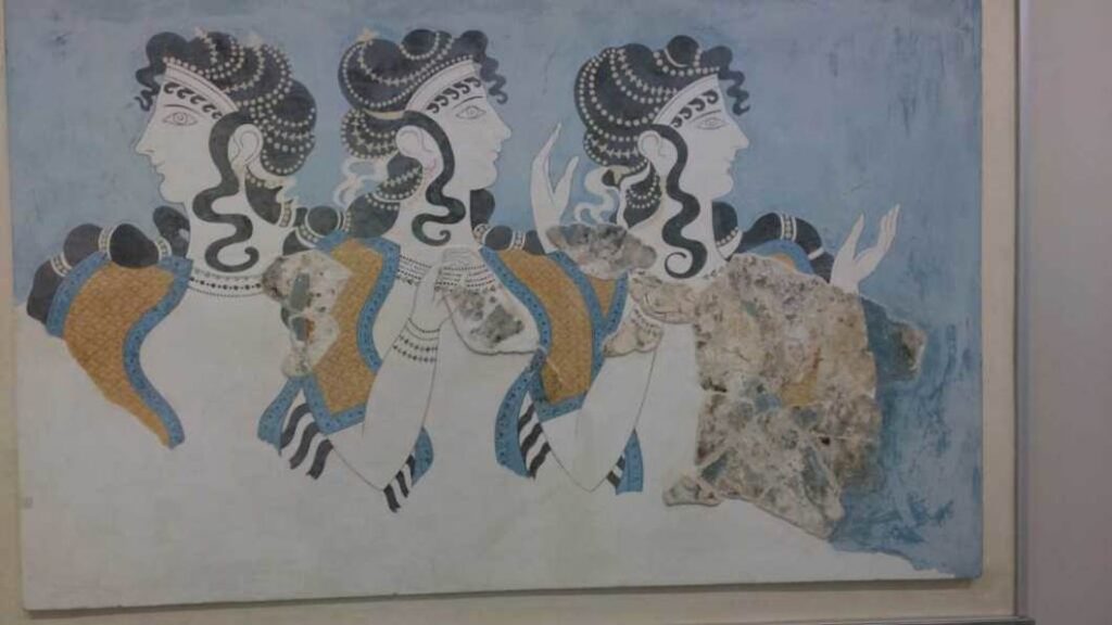 「青の婦人たち」と呼ばれる壁画。背景が青色です。クノッソス宮殿東翼から見つかった。