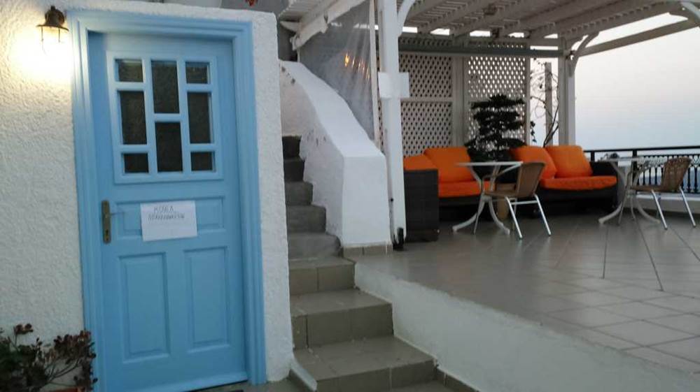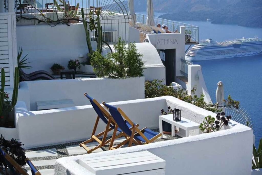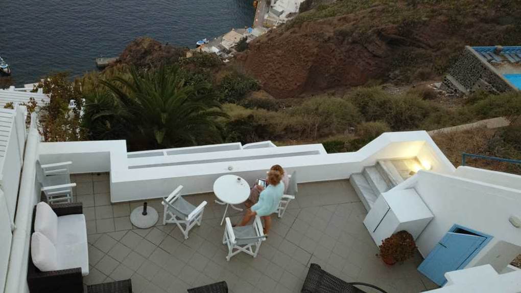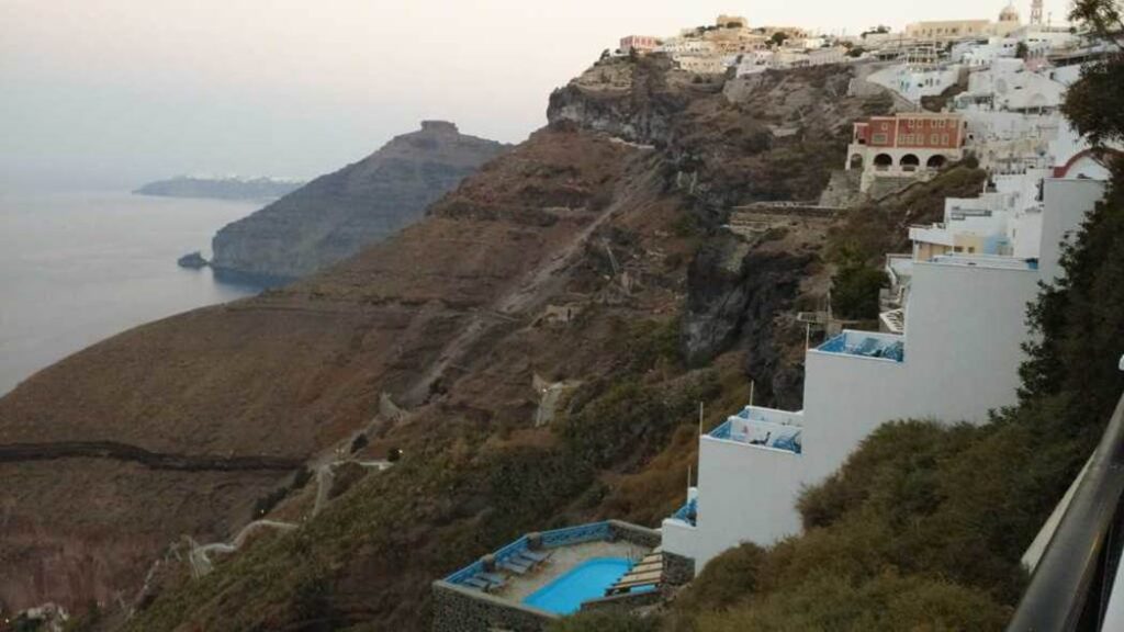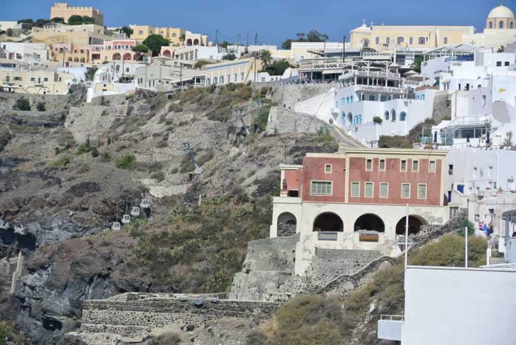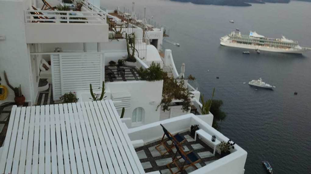 写真右側に、崖の岩肌にへばり付いた階段状のホテルの側面が見える。フィラのホテルの典型的な形態である。