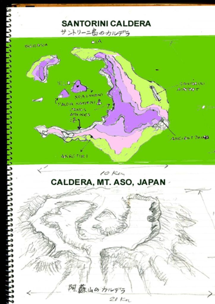 世界最大級の阿蘇山のカルデラ草千里とその外輪山、阿蘇山中岳火口の地図をサントリーに島との比較のため、同縮尺のスケッチにしたためてみました。(上)