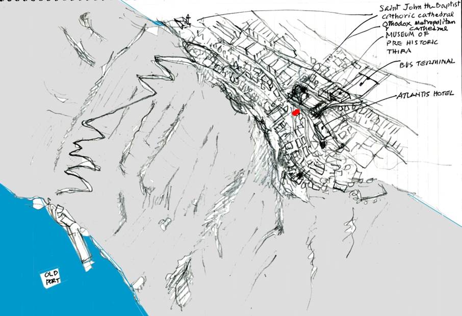 下のスケッチ地図上の茶色い部分は、標高約300mで、大噴火により形成された外輪山である。カルデラ平原に相当する部分は水没し、海となっています。そのカルデラの中心部分に位置するネア・カメニ島は、現在も活動する活火山である。