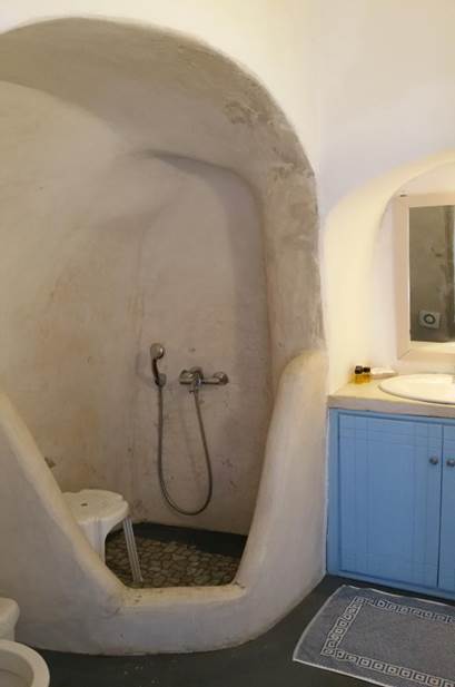 サントリーニ島には川も池もないそうだ。 水はタンカーで運ばれてきて、燃料のように港のタンクに貯蓄される。 そこから大型揚水ポンプで各戸に配水されている。停電になると水の配給が止まる。これがサントリーニ島のアキレス腱である。シャワールームの水も大切に使用しなければなりません。
