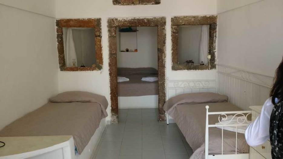 洞窟の寝室。この上に通路があり、時にはロバのひずめの音が天井から聞こえることがある。サントリーニ島ならではの体験が出来る。