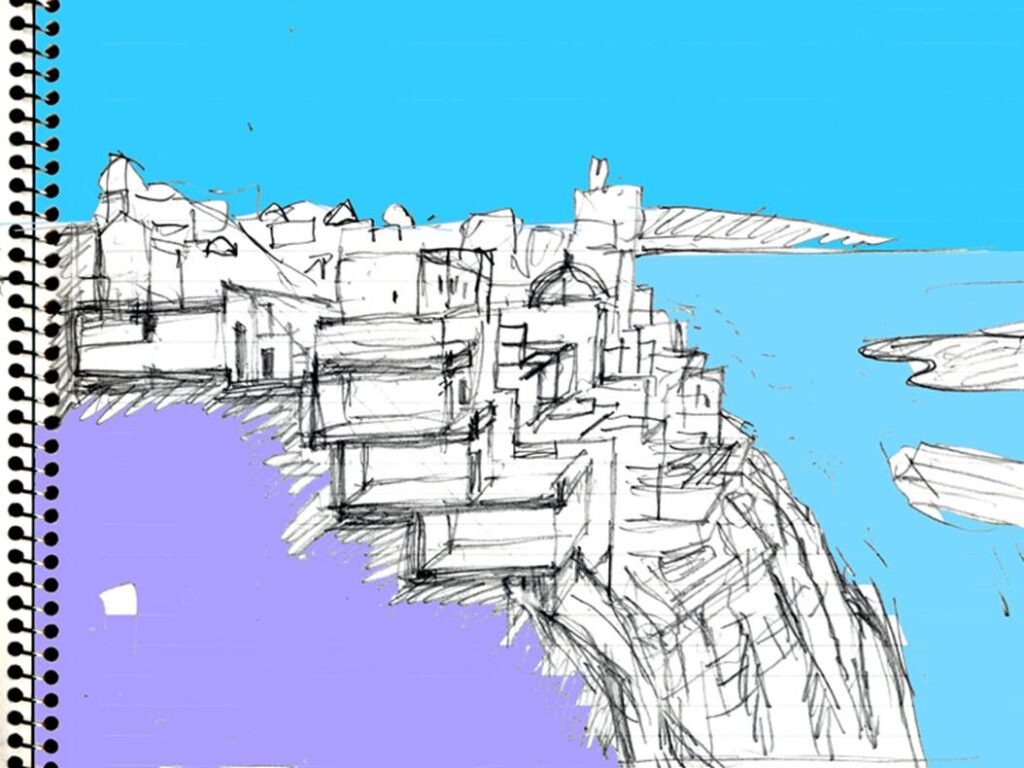 海を見下ろす断崖絶壁にへばり着いて建つ洞窟ホテル断面の即席スケッチ。
