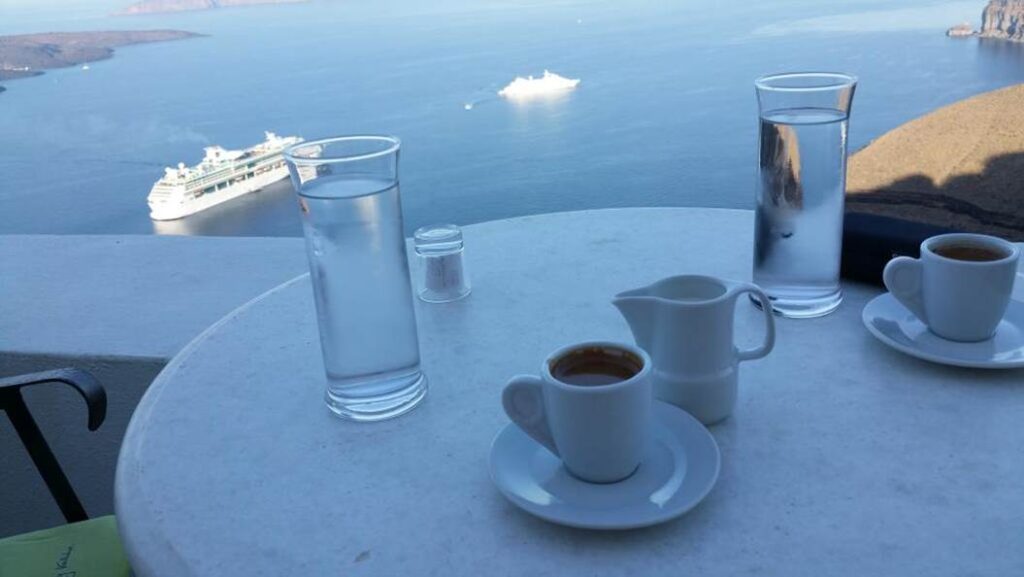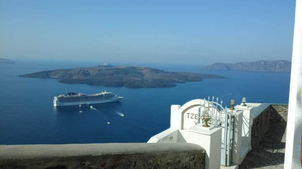 地中海のクルーズ船2隻が停泊しています。サントリーニのお土産やさんにとっては、稼ぎ時ですね。
