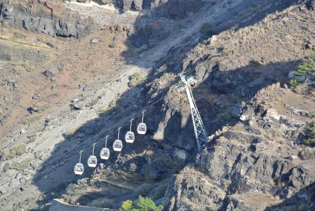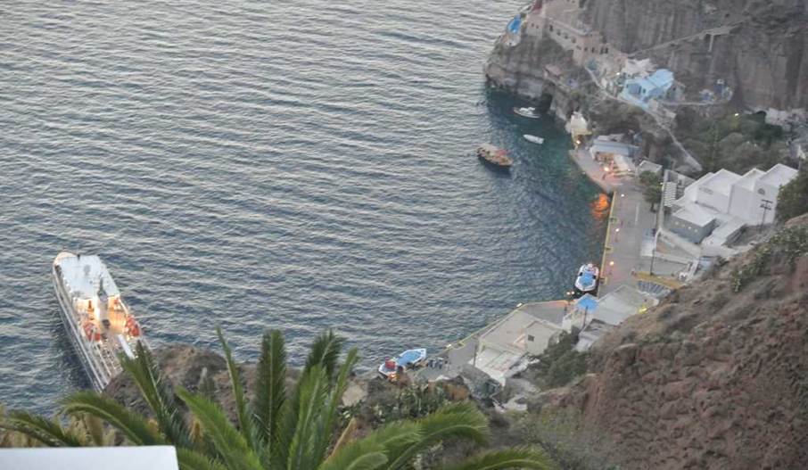 外輪山の崖下にある小さな小さな船着場です。ここからクルーズ船の観光客が崖上のフィラの街へ、ケーブルカーやロバを使い登って行きます。早朝、ホテルのテラスから撮影。