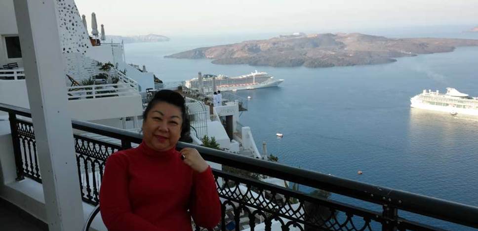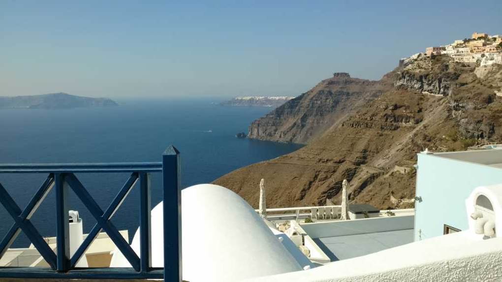 レストラン屋上からの眺望。右端はフィラの街、遠方にイアの街。この二つの町は、外輪山上に細長く、帯状に繋がっています。約10キロぐらいの距離があります。