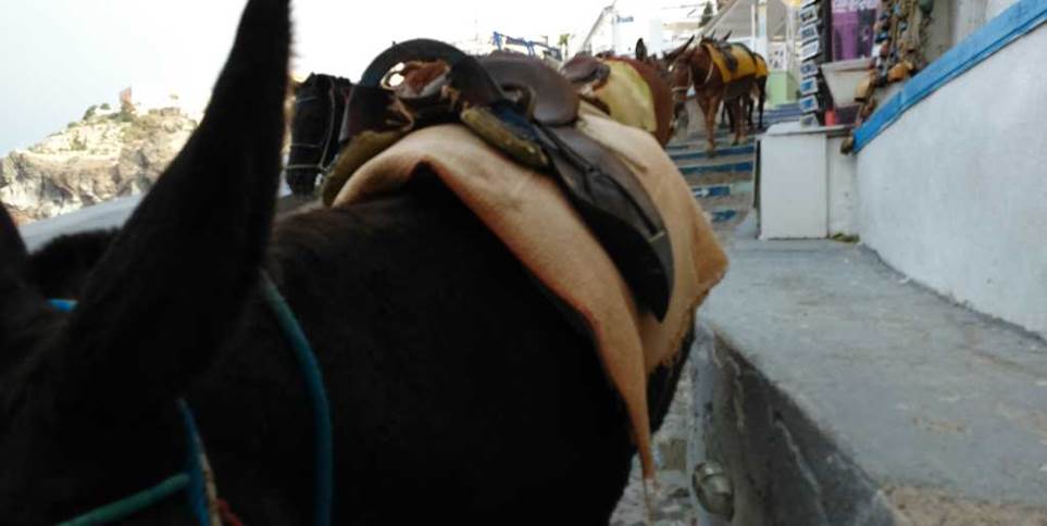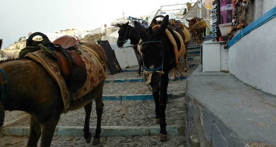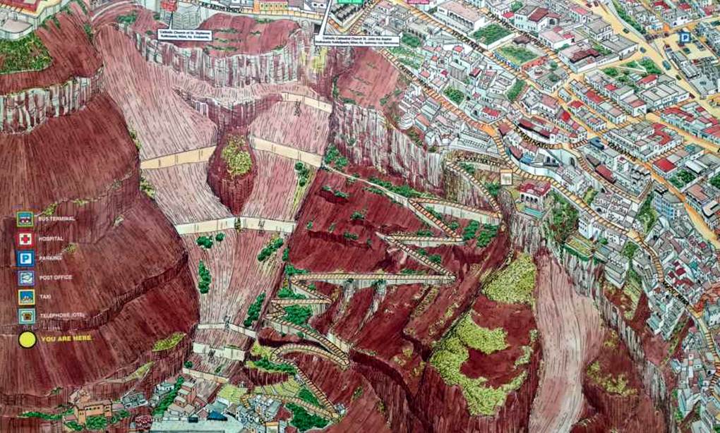 下の絵地図の中の断崖にジグザグ道が記されている。これがフィラの街と300m下の船着場を結ぶいわゆるロバ街道である。