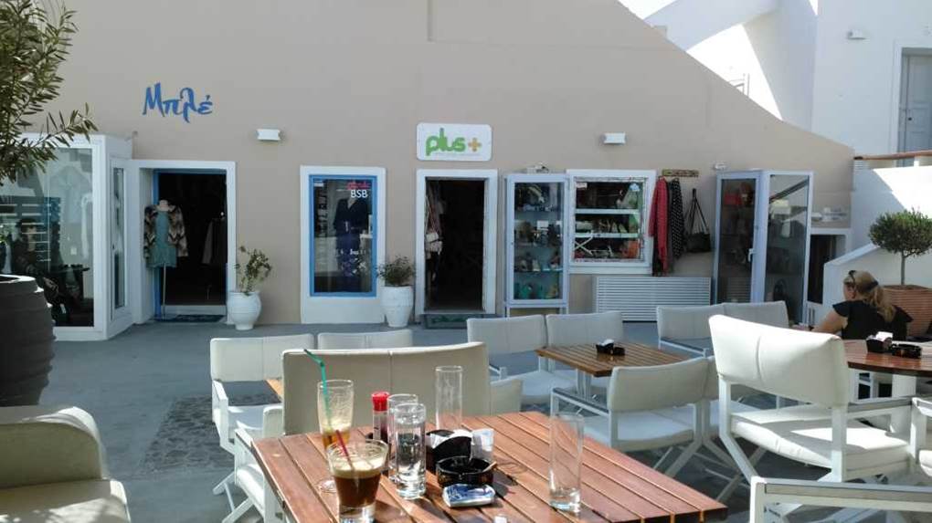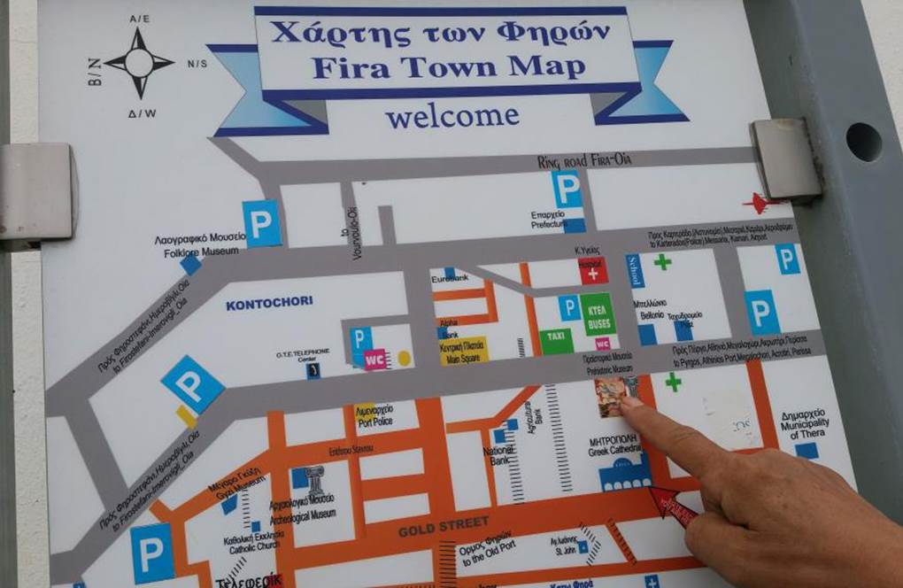 フィラの街の中心部の小さな商業施設に着き、ここでランチタイムとなりました。地図上のグレーの道は車道で、オレンジ色の道は歩道です。