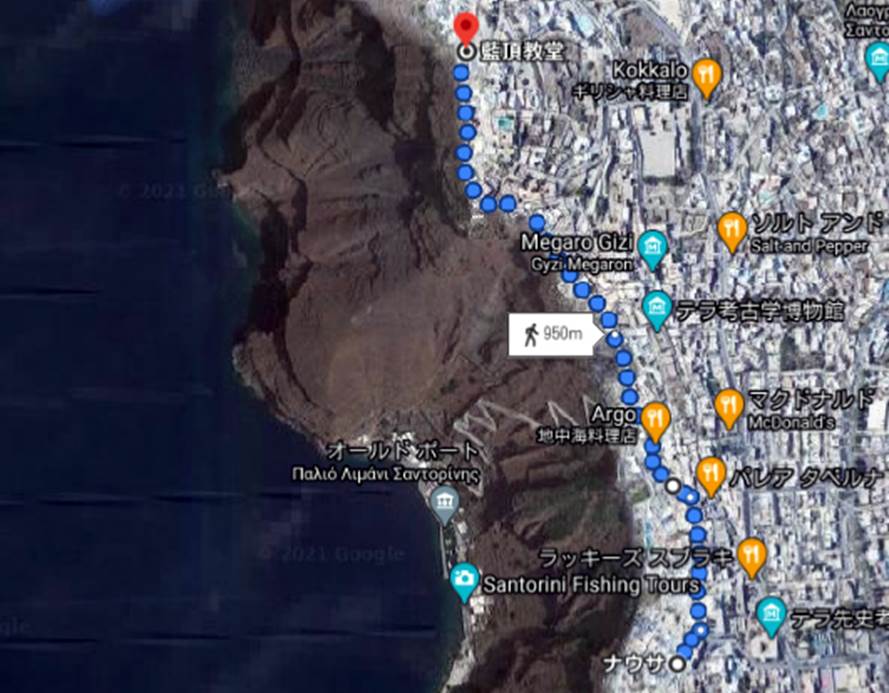 行程は、ホテル⇒ナウサ・レストラン⇒メトロポリタン大聖堂⇒ロバの坂道⇒カトリック教会⇒フィラ中心部の小さな商業施設⇒フィロステファニ地区ブルードーム で1km程の歩きめぐりです。