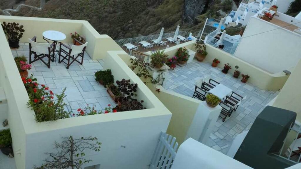 小さな鉄の扉があり、そこを入り階段を下りると、断崖にへばりついたホテルがあります。これがサントリーニの典型的なホテルへのアプローチ方式です。