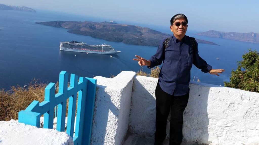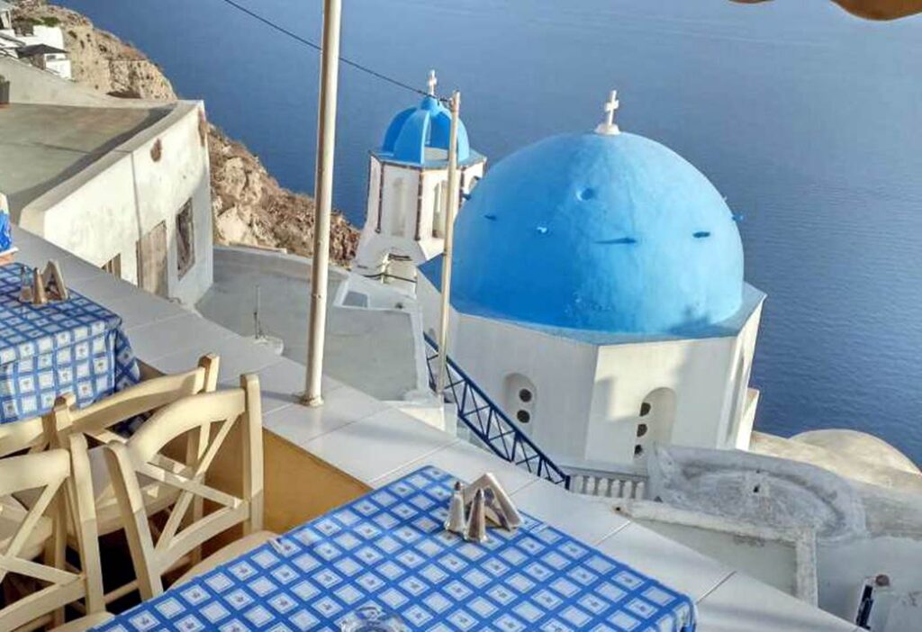 サントリーニ島フィロステファニ地区のブルー色ドームの教会。外輪山崖上ギリギリの狭隘地に建てられています。サントリーニ島を代表する「写真映え」のスポットである。