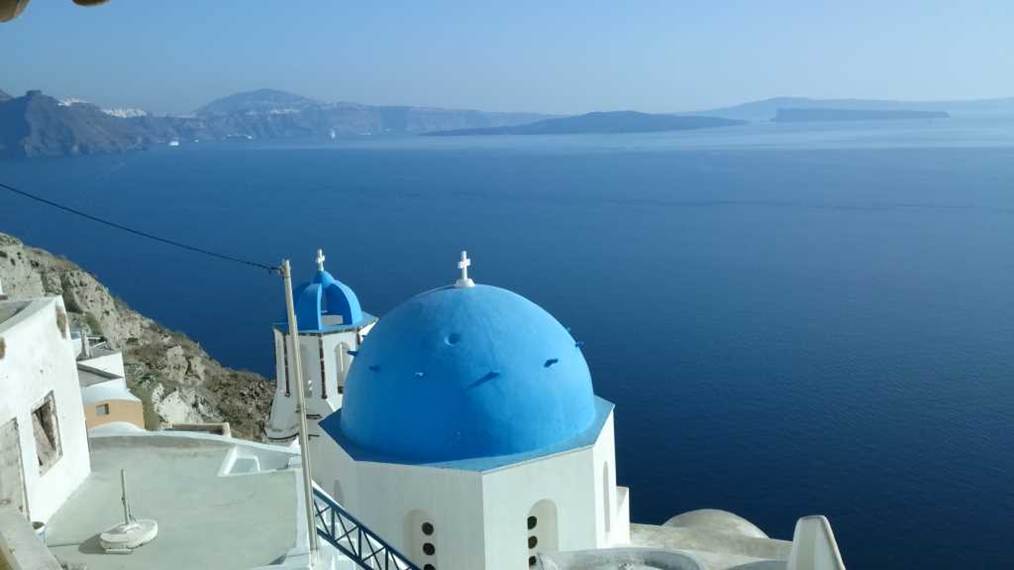 ここイア地区の教会のドーム屋根は、フィラ地区のそれとは違いブルー色で統一されています。