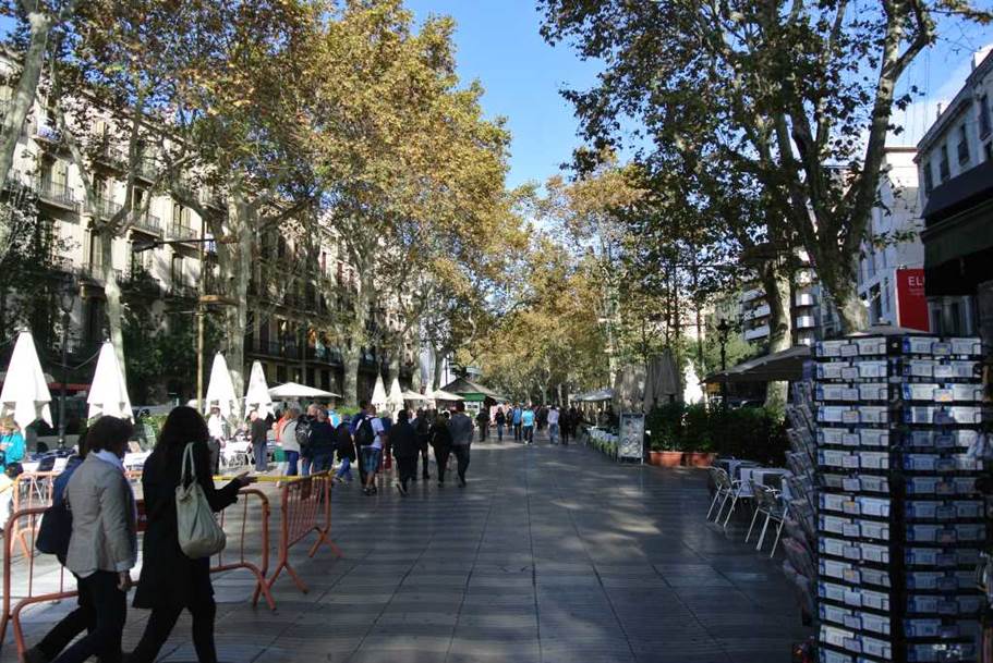 夜遅くまで多くの人通りでごった返し、花屋、鳥屋、大道芸人、カフェテリア、レストランが並ぶ歩行者のための大通りである。 ランブラス通りにはさまざまな建造物が立ち並んでいる。世界的に有名な大劇場、市場もある。
