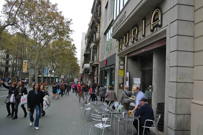 外部の散策路にテーブルと椅子が設けられている。ここで街行く人を眺めながら一服するのも悪くない。空いていた席に陣取る。灰皿もちゃんとあり、当時は喫煙は自由であった。500mlのハウスワインの赤を注文したら、たったの2ユーロであり、タパスをサカナにごきげんな時をすごした。ランブラス通りにて。