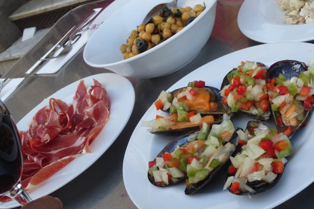 野外のテーブルで、いろいろなタパスの小皿料理を食べ比べ賞味することが出来る。
