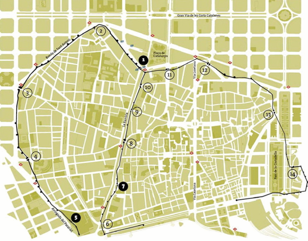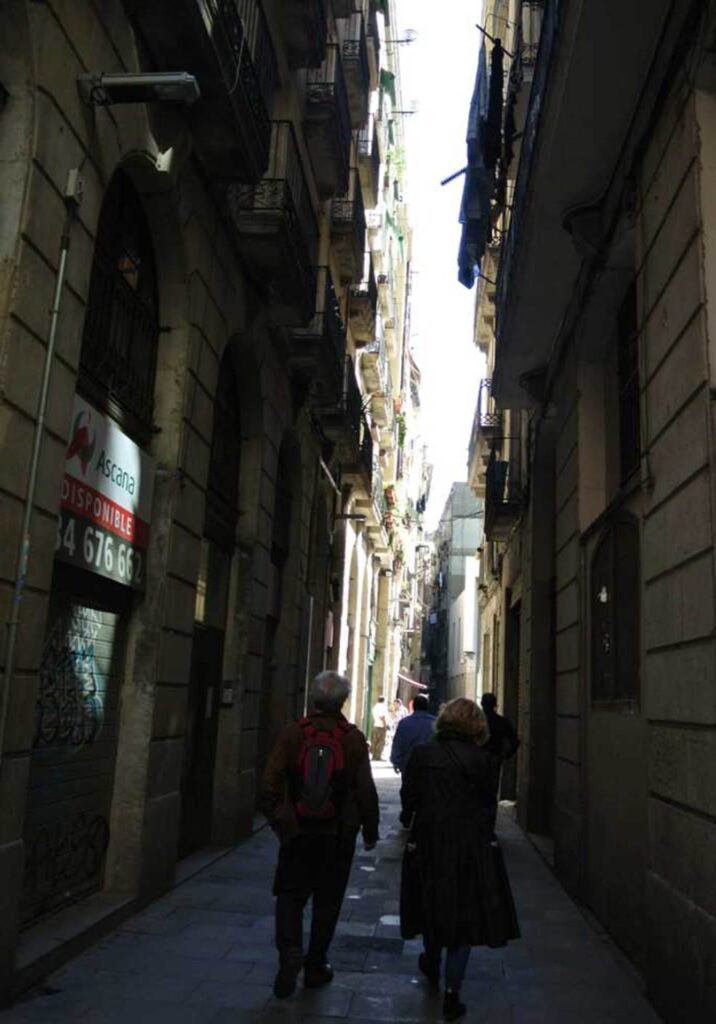 バルセロナは、14世紀に建設された城塞に囲まれた2キロ四方の旧市街地を起源とする。道路は無秩序に張りめぐらされている。