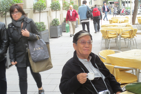 バルセロナの旧市街地・ゴシック地区の広場で、エスプレッソを共に筆者しばしの休憩。