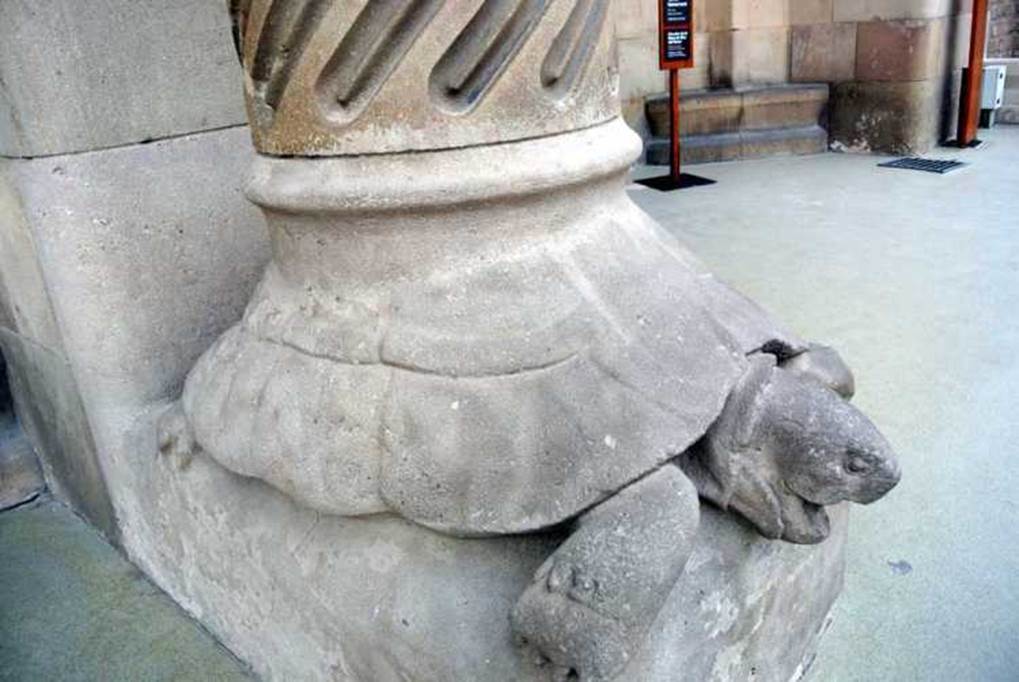 中央の門を構成する柱の土台には変わらないものの象徴として亀が彫刻されている。