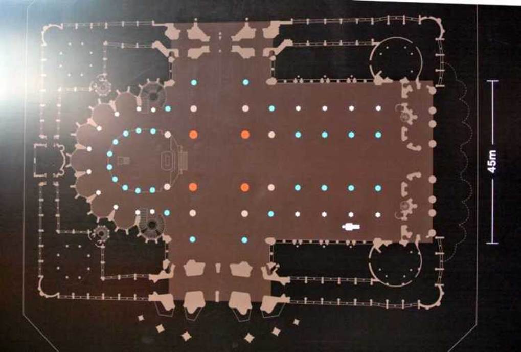 聖堂の平面図を見ると、一見は典型的なラテン十字の三廊式であるが、それ以外は伝統的な聖堂とは全く異なる空間表現になっていた。