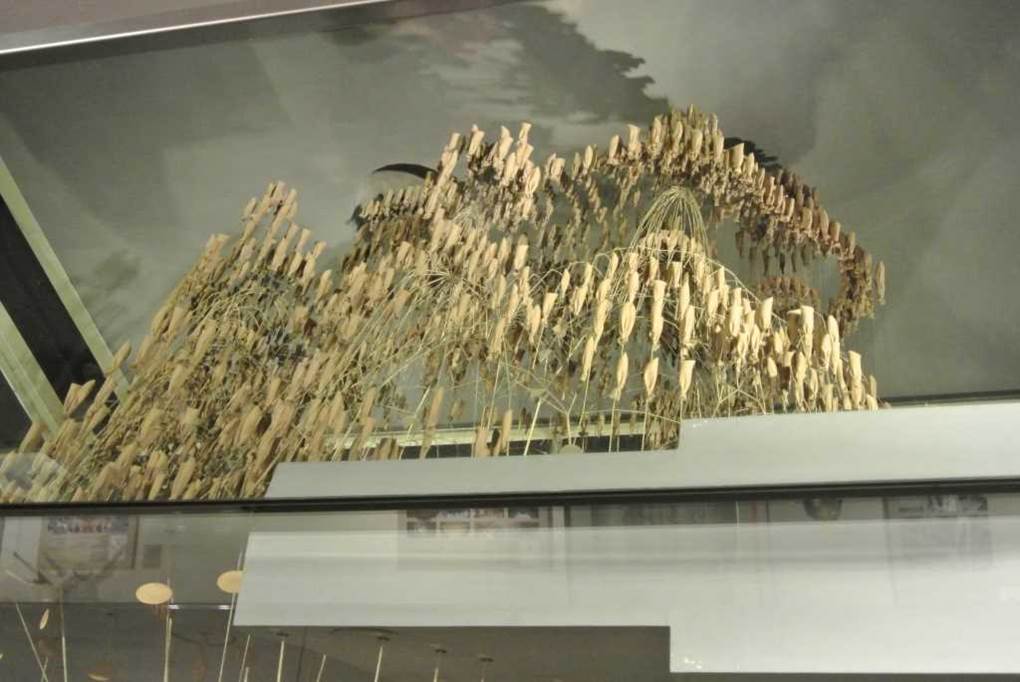 これは、錘と糸を利用したサグラダファミリアの逆さ吊り模型「フニクラ」です。ガウディは複雑な計算を行わず、自然な曲線を描き力学的に安定したフニクラを利用して設計をした。この模型を上下逆にすると、サグラダファミリアの形になる。