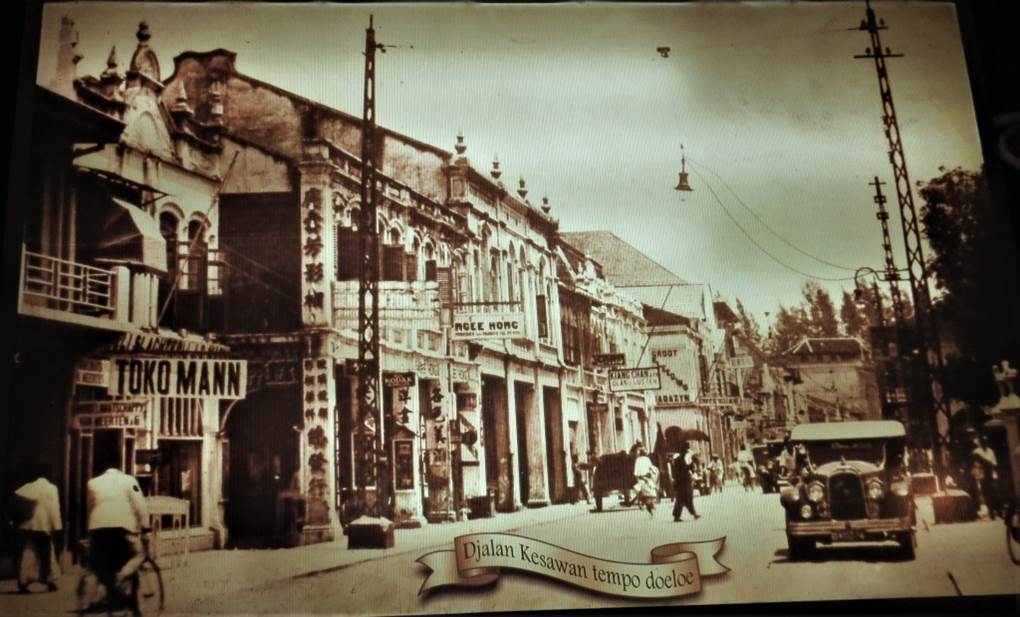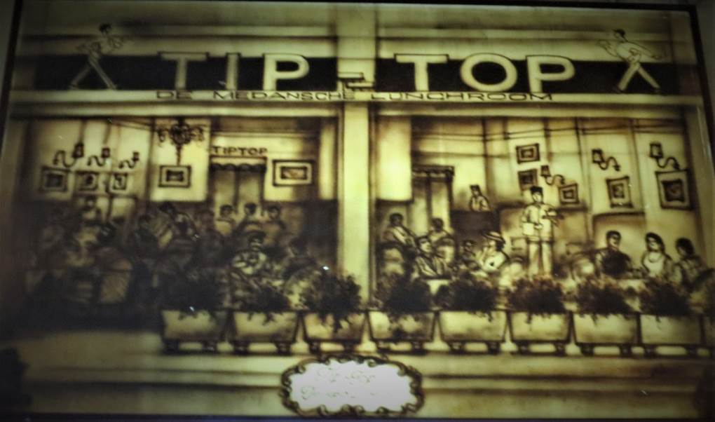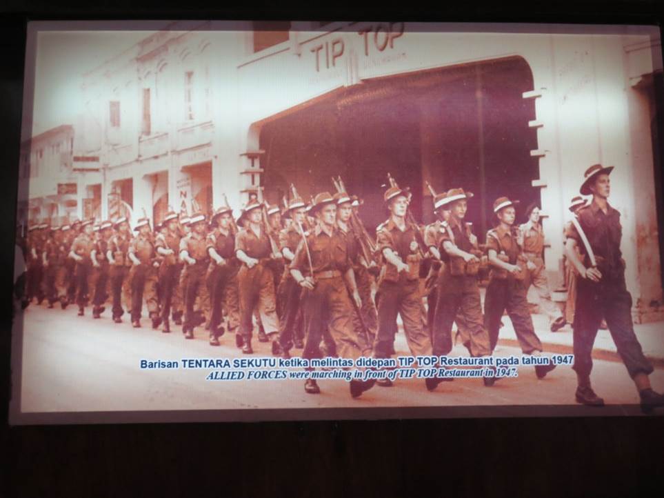 第二次世界大戦で日本軍が撤退した後、オランダ軍と連合軍兵士が戻って来て、TIPTOPレストランの前面道路を行進している貴重な写真。
