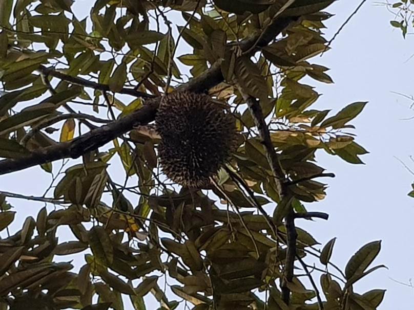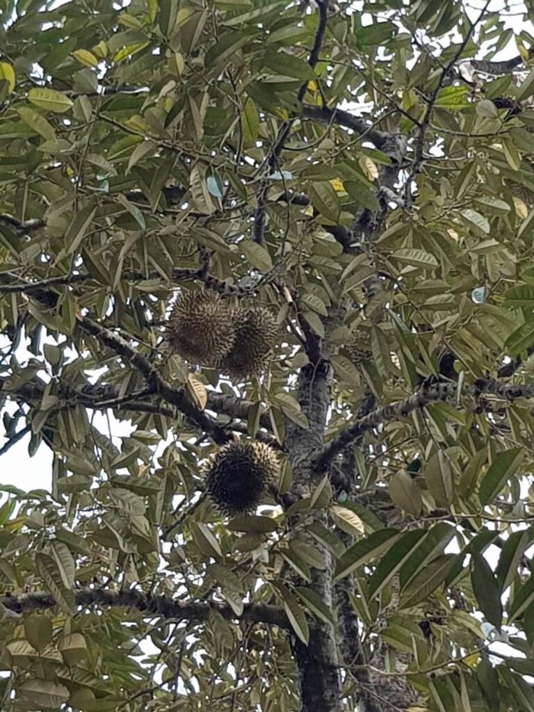 ドリアン・プランテーション内の樹木にドリアンの実がぶら下がっている。