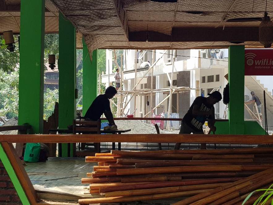 川岸の近くに簡易なコテッジ風の建物が連なっていて、ある一定の“エコ好き”な訪問者が滞在する建物だと思われます。
