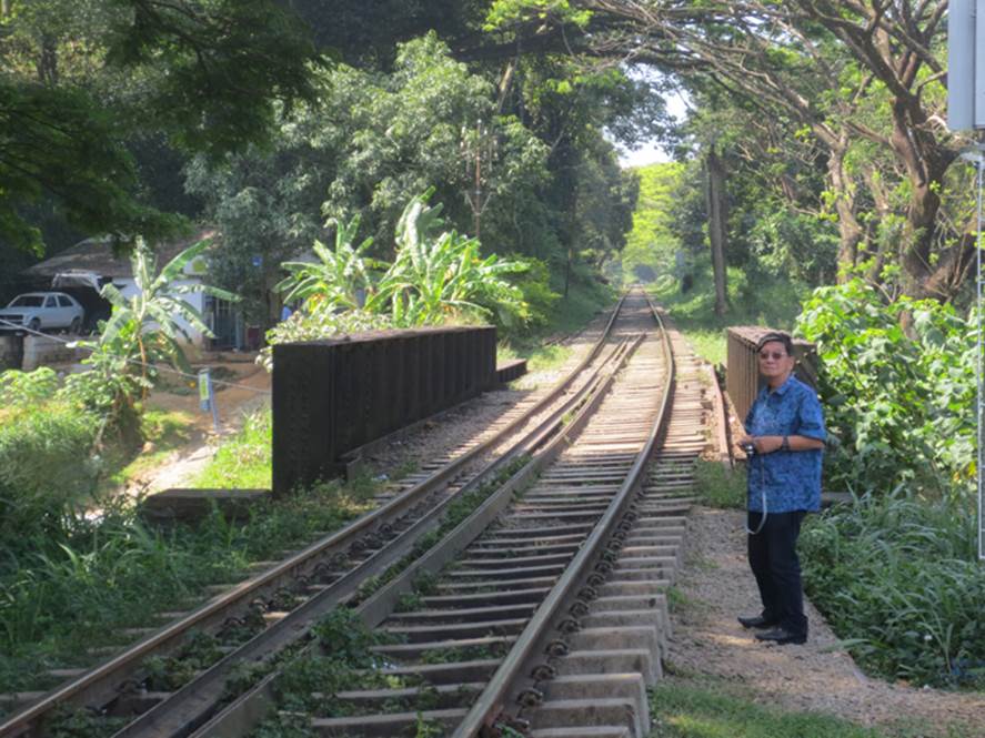 スリランカ国鉄の踏み切り近くで、車を降り撮影。堂々の広軌鉄道であった。