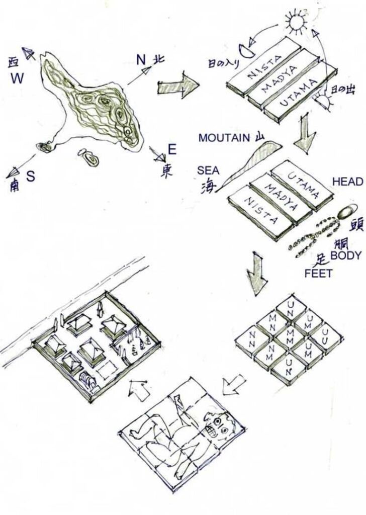 バリ島の村落で住居用の敷地に建築を施す場合、巻尺、トランシット、金尺などを使わず建物を建てられていることを知ったとき、とても信じられない思いであった。