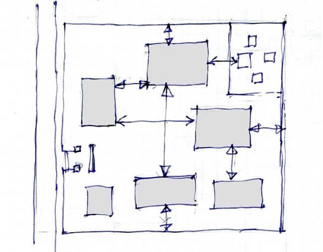 まず、温帯の場合の住居は、居間、寝室、台所、トイレなどは、一つの棟の中に集約し、用途、機能性、日当たり、通風、景観、などに考慮しレイアウトを定るのが基本である。