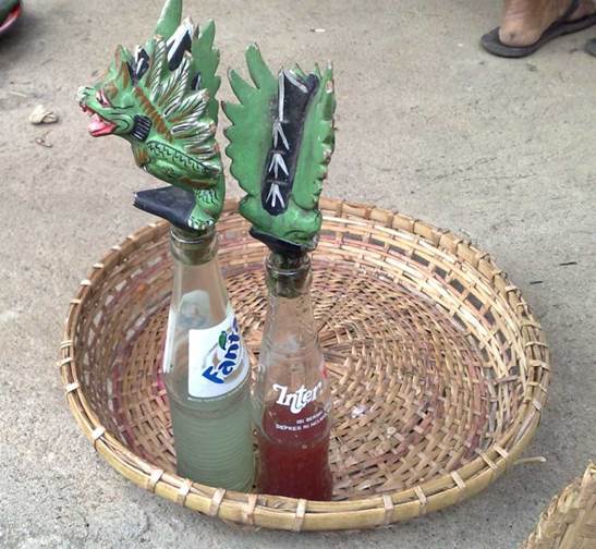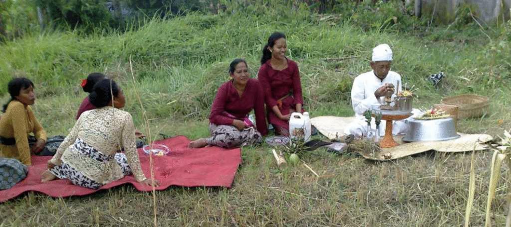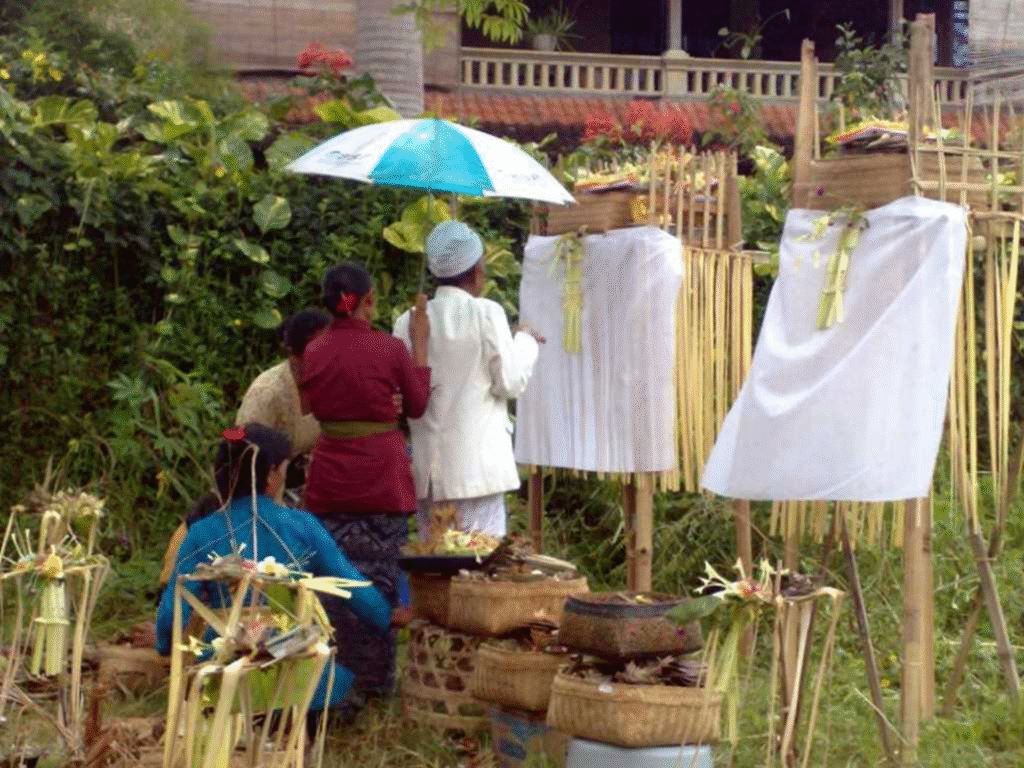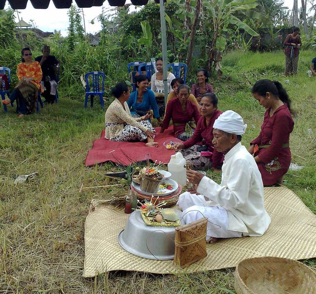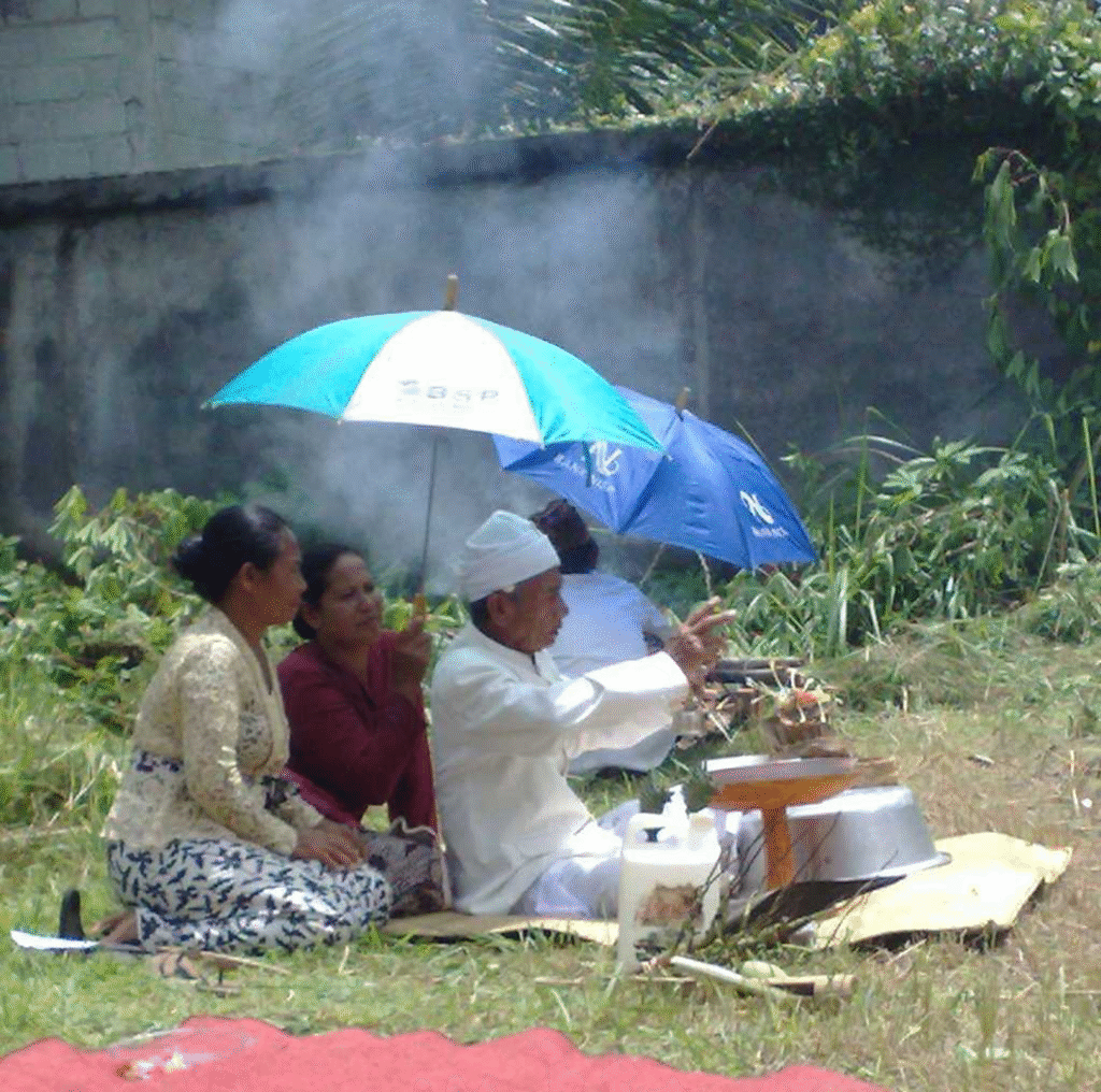 僧侶は村落(デサ)の寺院(プラ)から2本のガラスのボトルに入った聖水を持ち出し、オーナーの額に米粒を聖水とともにぬりつけ、そして少量の聖水をオーナーの口に含ませる。