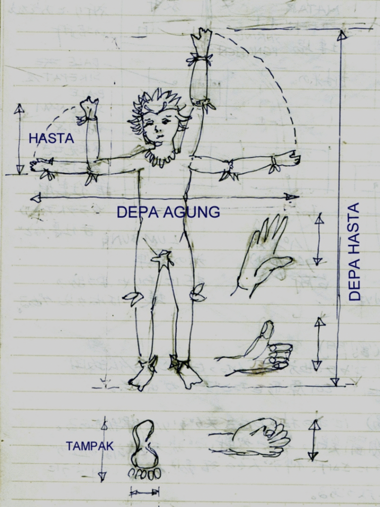 建築に使う寸法とは、メートル法、フィートーインチ法、昔の日本で言えば旧尺貫法など、いずれも客観的な寸法を採用している。後になって、バリの場合の独特の寸法の概念を知ることになった。とてもユニークな寸法の測り方なので、それをここに記したいと思う。