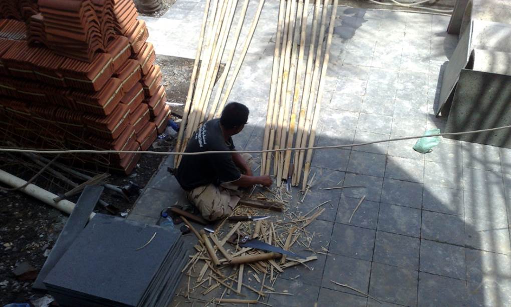 共同作業で、円錐形アランアラン屋根を葺く。筆者設計ウブドグリーンリゾート内レストラン。