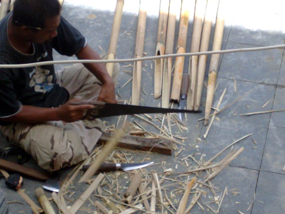 竹の先端を削ぎ鋭角状にして頂点を納めるための準備作業。