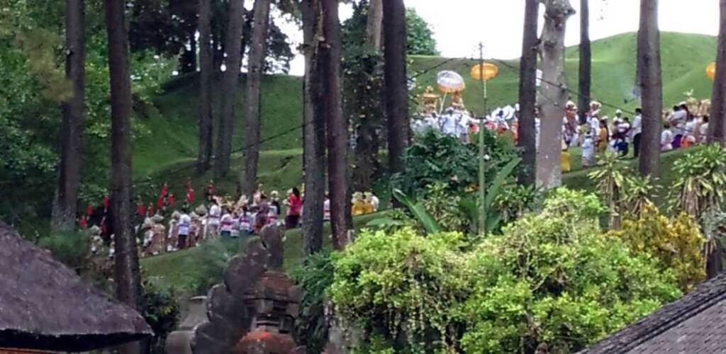 Villagers come down from the neighbouring former villa of President Sukarno in a procession to the temple. They gather at the assembly hall in the outer garden, prepare prayers and offerings, and then proceed to the inner garden to pray.